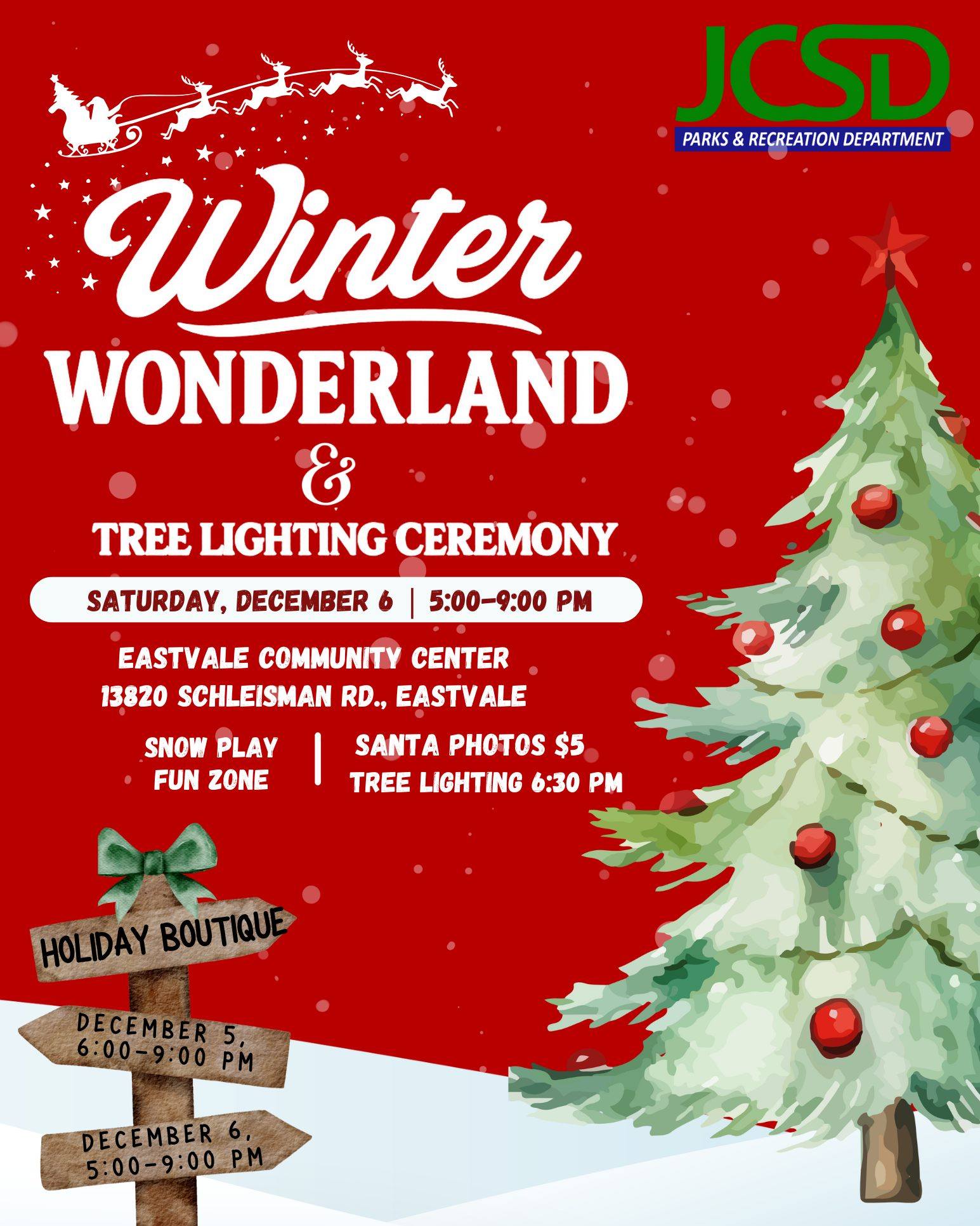 Enjoy snow play, a fun zone, Santa photos – $5, and the magical tree lighting at 6:30 PM!